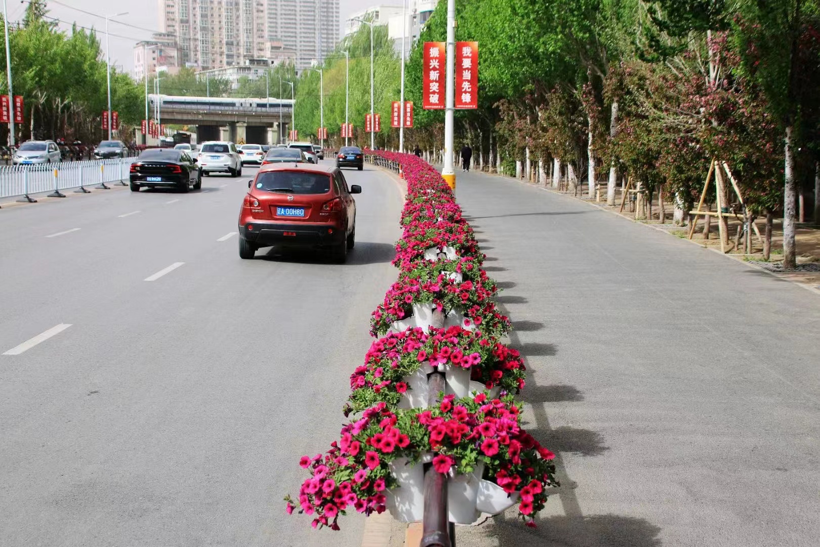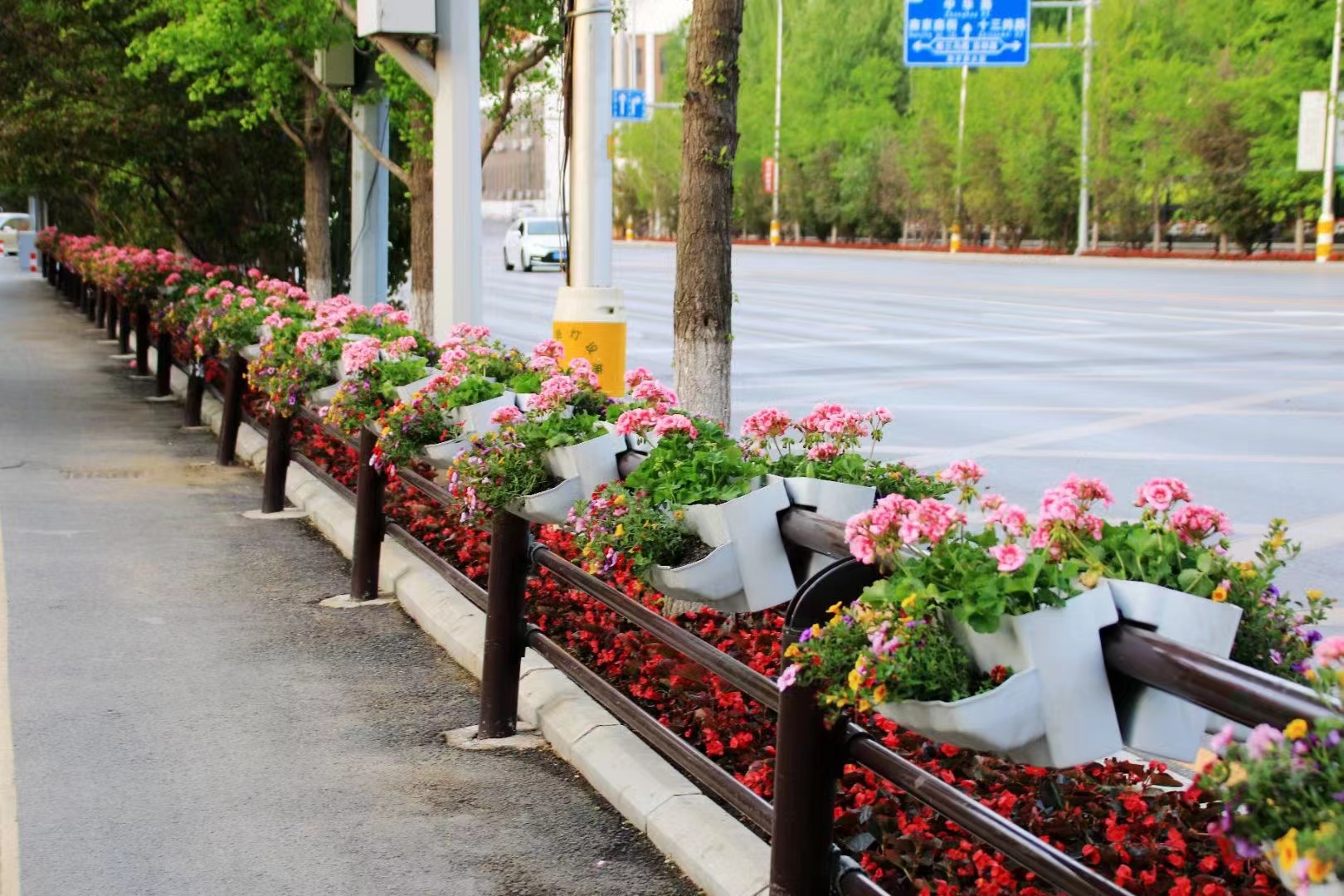 雙層結構更實現綠量翻倍,上層綻放繁花、下層垂吊蔓枝,形成層次豐富的立體景觀,讓原本單調的護欄成為兼具隔離與觀賞功能的“空中綠帶”。